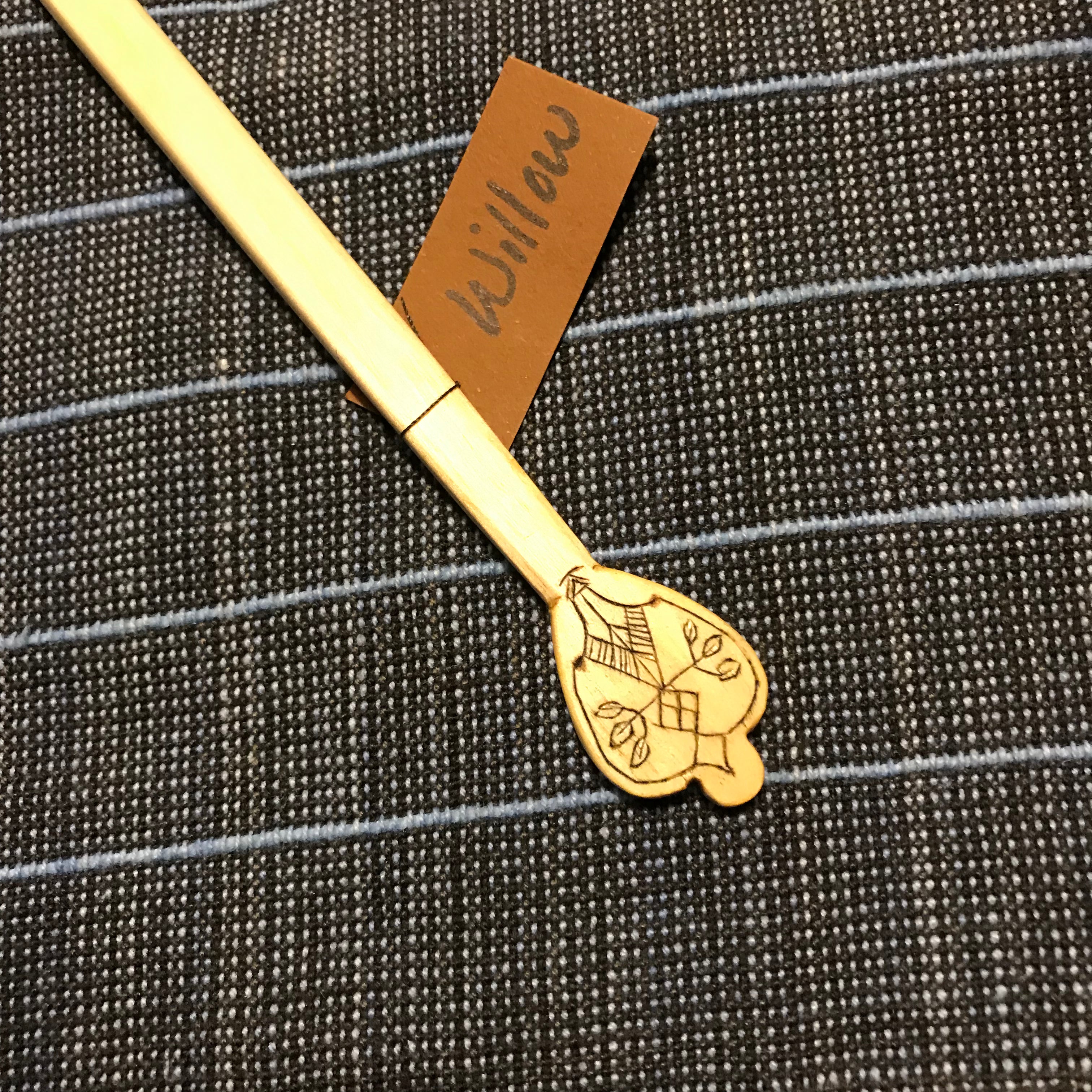Pictured, from left: Fruitwood Pickle Fork 8", Fancy Maple Pickle Fork 10", Plum Narrow Spreader 8.75", Willow Incised Pickle Fork 10.25" - see second photo for incised detail!